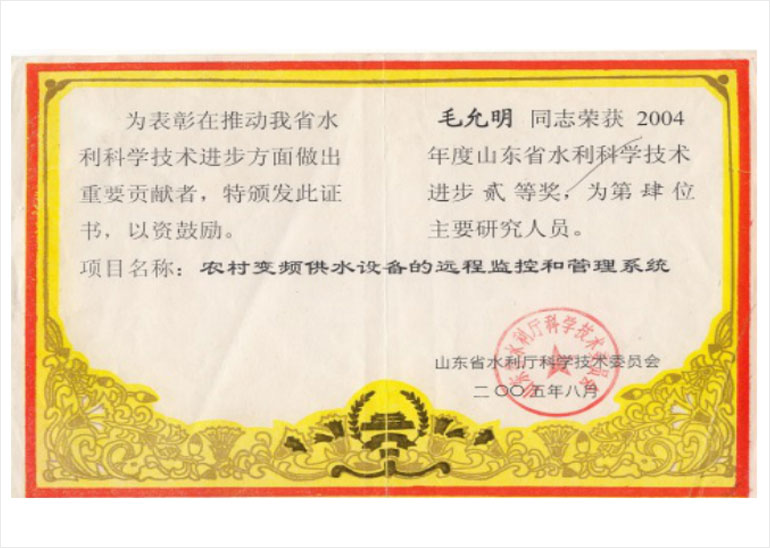 在“依科技創(chuàng)新發(fā)展”的理念引導(dǎo)下,為進(jìn)一步提高農(nóng)村變頻供水系統(tǒng)的科技含量,完善農(nóng)村供水管理和服務(wù)體系,公司研發(fā)了多項相關(guān)技術(shù),其中“農(nóng)村變頻供水設(shè)備的遠(yuǎn)程監(jiān)控和管理系統(tǒng)”及“供水自動化智能控制與全數(shù)字動態(tài)顯示系統(tǒng)的研究”獲得了山東省水利廳科學(xué)技術(shù)進(jìn)步獎;