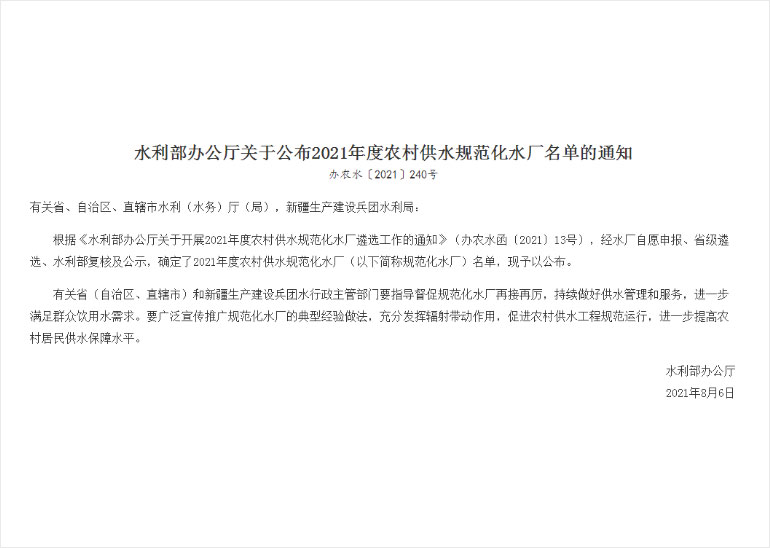 8月,公司承建的福建省柳泉模塊化凈水廠,入選“水利部2021年度農(nóng)村供水規(guī)范化水廠名單”。