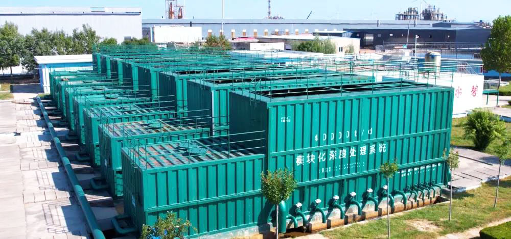 污水廠分為三級處理,分別是預處理-生化處理-深度處理。預處理主要去除污水中的大顆粒懸浮物和泥沙。生化處理階段采用A/A/O工藝,使得污水中的污染物在微生物的作用下被降解和轉(zhuǎn)化為污泥。深度處理就是利用模塊化深度處理設(shè)備對二沉池出水進行絮凝、沉淀、過濾等深化處理,進一步去除有機污染物并通過消毒劑對污水進行消毒。深度處理模塊采用了模塊化水處理新工藝技術(shù)。